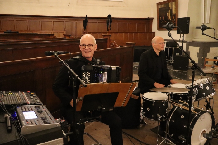 Omdat we in deze zaal goed contact hebben met de straat, trekken we de aandacht. Zo nu en dan kijkt men belangstellend naar binnen. Een stel dat voorbijloopt, wordt door ons optreden naar binnen gelokt. Ze genieten van de voorstelling, maken opnames en al snel gaan de jassen uit en wordt er een drankje besteld.