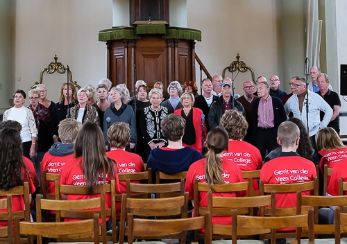 Voor de middagvoorstelling hebben we een primeur. André heeft nog steeds contact met een studiegenoot, die op Het Gerrit van der Veen College muziekles geeft. Het idee is ontstaan om leerlingen uit haar klas mee te laten doen met ons middagconcert.