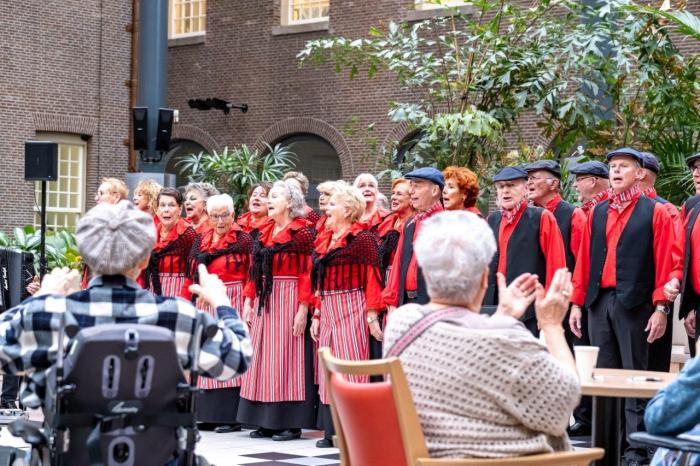 Het is altijd weer indrukwekkend om dit monumentale pand met zijn rijke historie te betreden. Vroeger diende het als opvang voor de arme, zorgvragende Amsterdammers, die moesten werken voor hun onderdak. Nu is het een liefdevolle plek geworden voor iedereen die zorg nodig heeft. De vroegere binnenplaats is met veel glas overdekt. Bij vorige optredens moesten bewoners, als de zon scheen, zelfs petjes dragen als bescherming. Vandaag is het koud en bewolkt, en geeft het vele glas de binnenplaats veel daglicht.