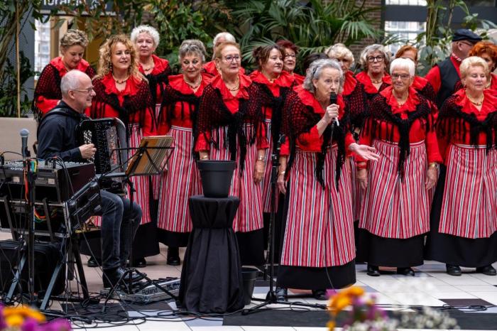We hebben maar kort pauze. Hans maant ons alweer om ons op te stellen. Maar dan is er even een koorlid in paniek. Haar kledinghangertje is weer zoek. Ze zoekt en zoekt, zelfs nog als we ons al opstellen. Behulpzaam zoeken sommigen tevergeefs mee, maar we hebben geen tijd meer en moeten op. Bij het opstellen komen de dames om haar heen niet meer bij, want daar is de kledinghanger! Hij bleek te hangen aan haar stola. Stikkend van het lachen is het lastig zingen, maar ze doen hun best en hopelijk viel het niet te veel op. De slapende dame is blijkbaar liefdevol naar bed gebracht, want we zien haar niet meer in de zaal.