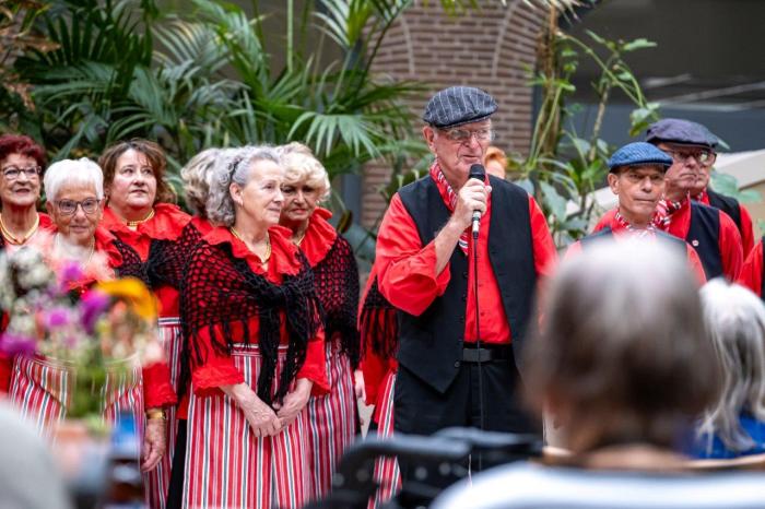Een heer in een rolstoel wordt bij zijn armen gepakt door de dame achter hem. Het doet denken aan een Titanic-houding, als ze zo samen mee wiegen op de nummers die we zingen.