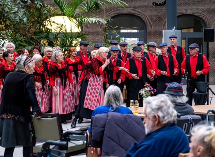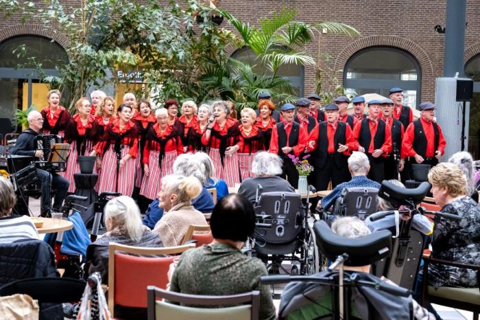 We beginnen vroeger dan normaal, maar de zaal zit al lekker vol. Het verheugt ons, dat we bekende gezichten zien in het publiek. Maar het is duidelijk, dat rond deze tijd er ook wel middagdutjes worden gedaan. Ontroerd zien we dat een dame, vergezeld door twee heren, in slaap is gesukkeld tegen de borst van één van de heren. Hij streelt liefdevol over haar rug. Zelf zingt hij veel nummers mee. Ook dat geeft voldoening: een gezellige middag geven aan al die mensen, die hun partner of ouders bezoeken.