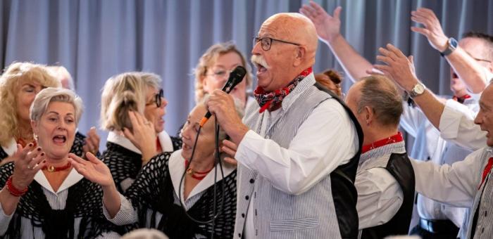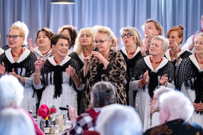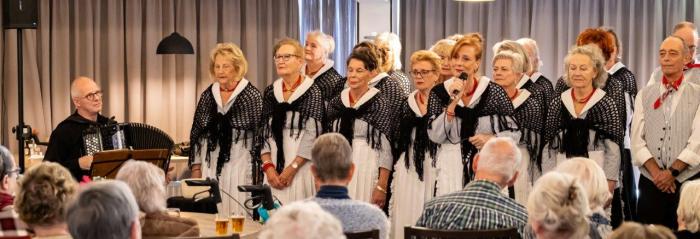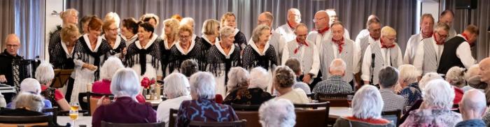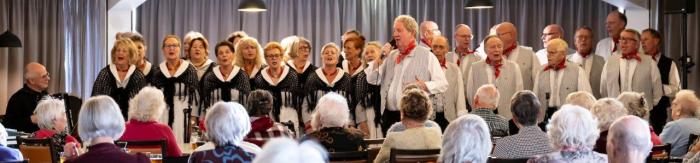 Vandaag gaan we optreden in Westerhaven in Hoorn. Deze locatie ligt prachtig aan het IJsselmeer. Voor de meeste koorleden nog best een eindje rijden, maar ja als je met elkaar meerijdt, is het ook wel weer gezellig. Het restaurant van het tehuis is een gezellige ruimte en er werd ons verteld, dat er deze middag extra veel bezoekers waren. Veel bewoners werden vergezeld door familieleden.